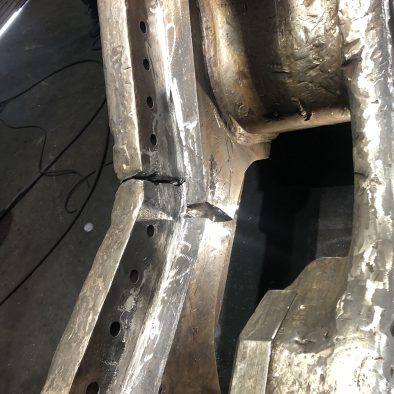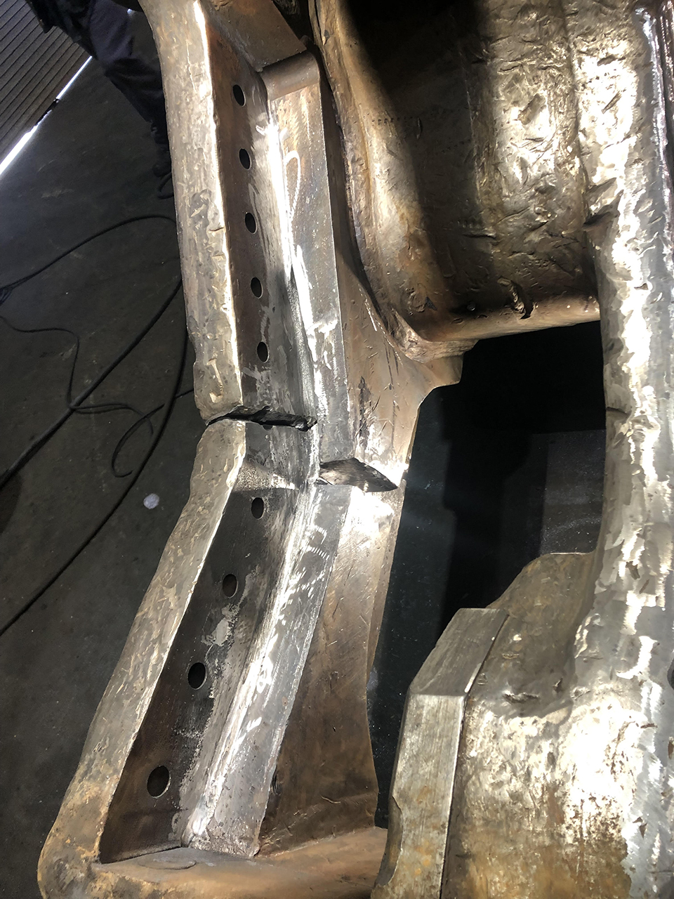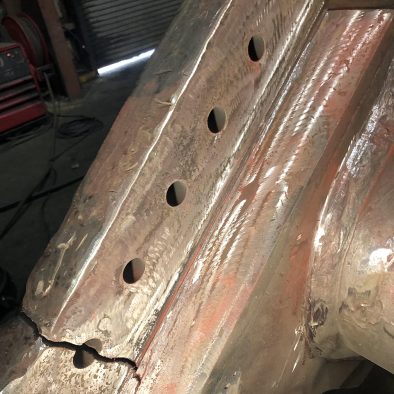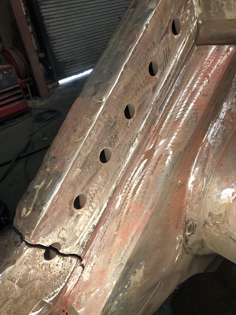 • Work consisted of magnetic particle inspections, welding repairs of all exterior main frame cracks and broken internal supports, Installation of factory heavy service frame plate kit.
